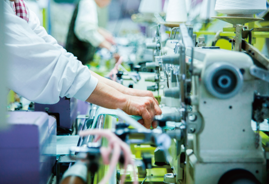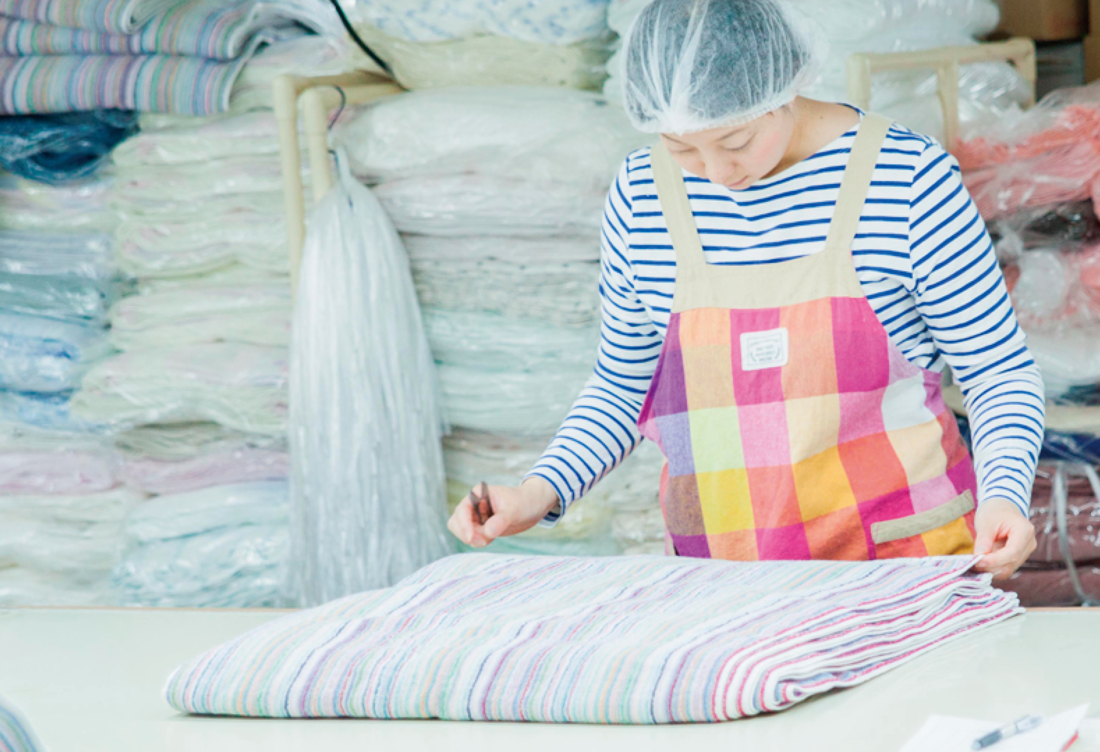 仕上げ場でタオル生地の裁断や縫製作業を行って